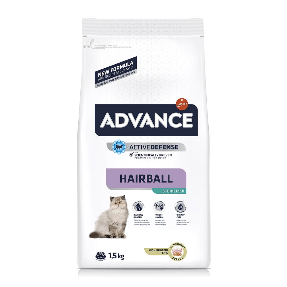 Wenn Ihre sterilisierte Katze an Haarballenbildung leidet, benötigt sie ein Futter, das dieser vorbeugt und zudem den Stoffwechselveränderungen entgegenwirkt, die eine Sterilisation nach sich ziehen kann, wie Gewichtszunahme, geringere Glukoseverträglichkeit und Harnwegsprobleme. ADVANCE Hairball Sterilized beugt ungewollte Gewichtszunahmen bei sterilisierten Katzen vor, verringert das Risiko von Harnwegsproblemen und beugt dank seiner Zusammensetzung auf Grundlage von Haferfasern und Malzextrakt der Haarballenbildung vor
