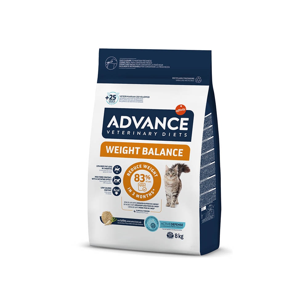 ADVANCE Veterinary Diets Weight Balance ist ein Diät-Alleinfutter für erwachsene Katzen, das zur Reduzierung von Übergewicht sowie zur Regulierung des Fettstoffwechsels bei Hyperlipidämie mit niedriger Energiedichte und geringem Fettgehalt sowie einem erhöhten Anteil an essentiellen Fettsäuren entwickelt wurde. Die Wirkung von ADVANCE Veterinary Diets Weight Balance wurde klinisch erprobt. 83% der Katzen verloren innerhalb von 3 Monaten* an Gewicht. (* Klinische Studie. Interne Daten.)