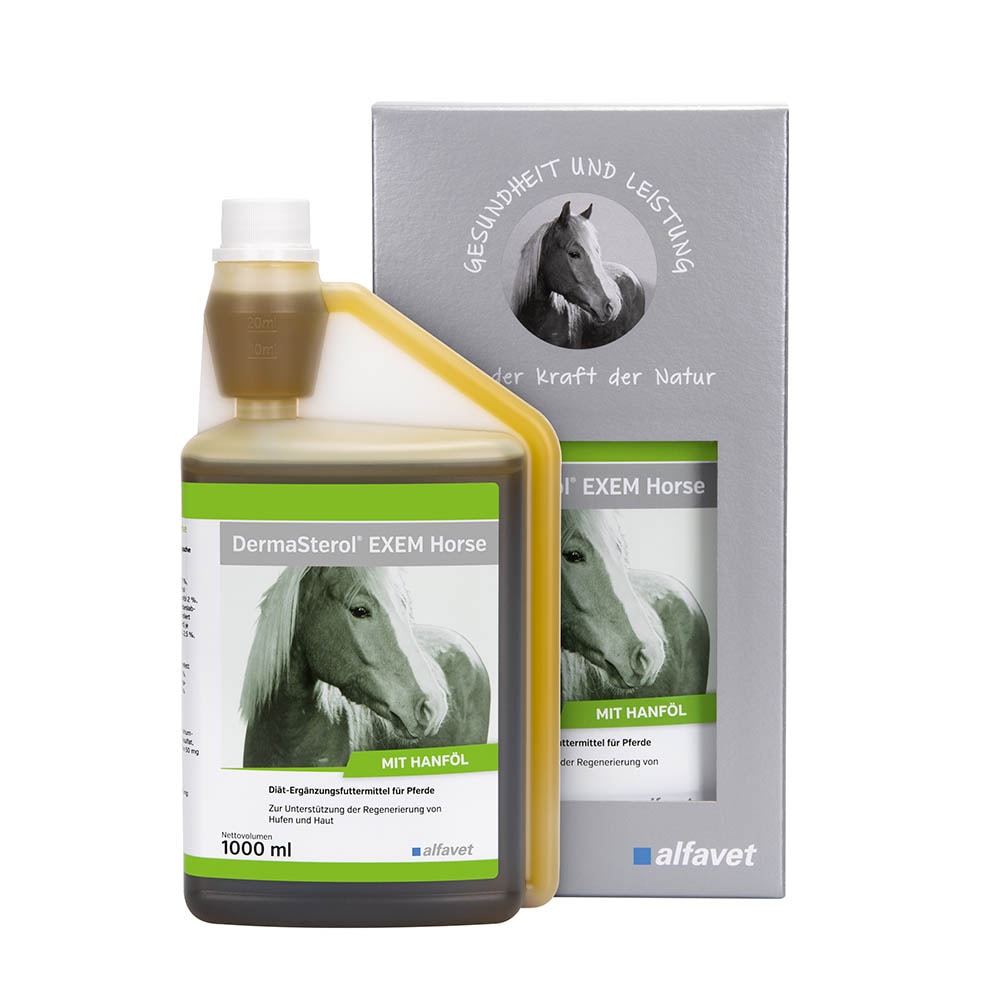 DermaSterol® EXEM Horse enthält eine Vielzahl an Nährstoffen, die insbesondere für den Aufbau von Haut, Haaren und Hufen benötigt werden. Es besteht aus Ölen mit einem hohen Anteil an Omega-3-Fettsäuren und α- und γ-Tocopherolen. Darüber hinaus ist DermaSterol® EXEM Horse mit Phytosterolen angereichert, die natürlicherweise in geringen Mengen in Pflanzen vorkommen, sowie mit Zink und Biotin. Wesentliche ernährungsphysiologische Merkmale: Hoher Zinkgehalt