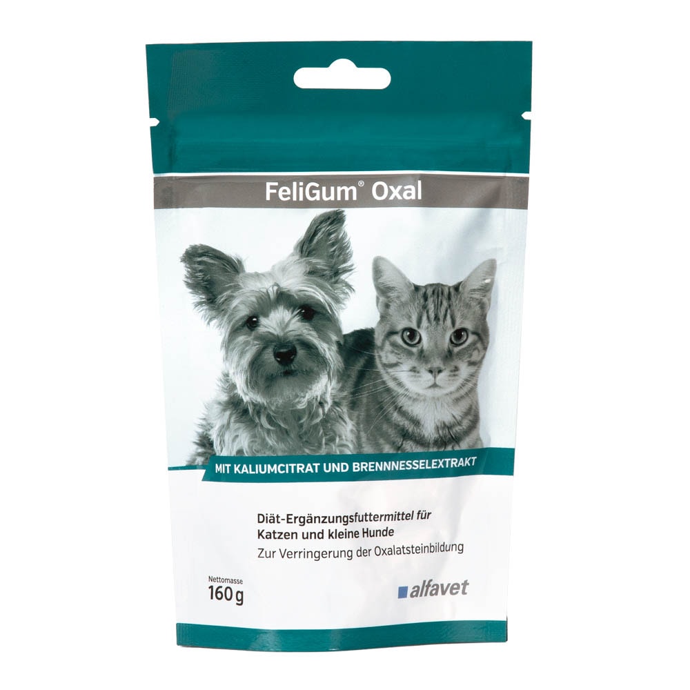 FeliGum® Oxal hat harnalkalisierende Eigenschaften und verringert so das Wiederauftreten von Oxalatsteinen. Gleichzeitig wird das Harnvolumen erhöht. FeliGum® Oxal ergänzt die Nahrung mit Substanzen, die für den optimalen Schutz der Harnwegsschleimhäute in ausreichender Menge aufgenommen werden müssen.