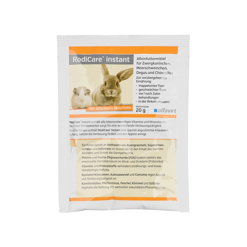 RodiCare® instant ist ein hochwertiges, rohfaserreiches und calciumarmes, pulverförmiges Alleinfuttermittel für Zwergkaninchen, Meerschweinchen, Chinchillas und Degus, die vorübergehend selbstständig keine feste Nahrung aufnehmen können. RodiCare® instant kann auch als Futtergrundlage für andere inappetente Kleinnager, pflanzenfressende Reptilien und Vögel genutzt werden, muss dann aber nach den Bedürfnissen der jeweiligen Spezies ergänzt werden.