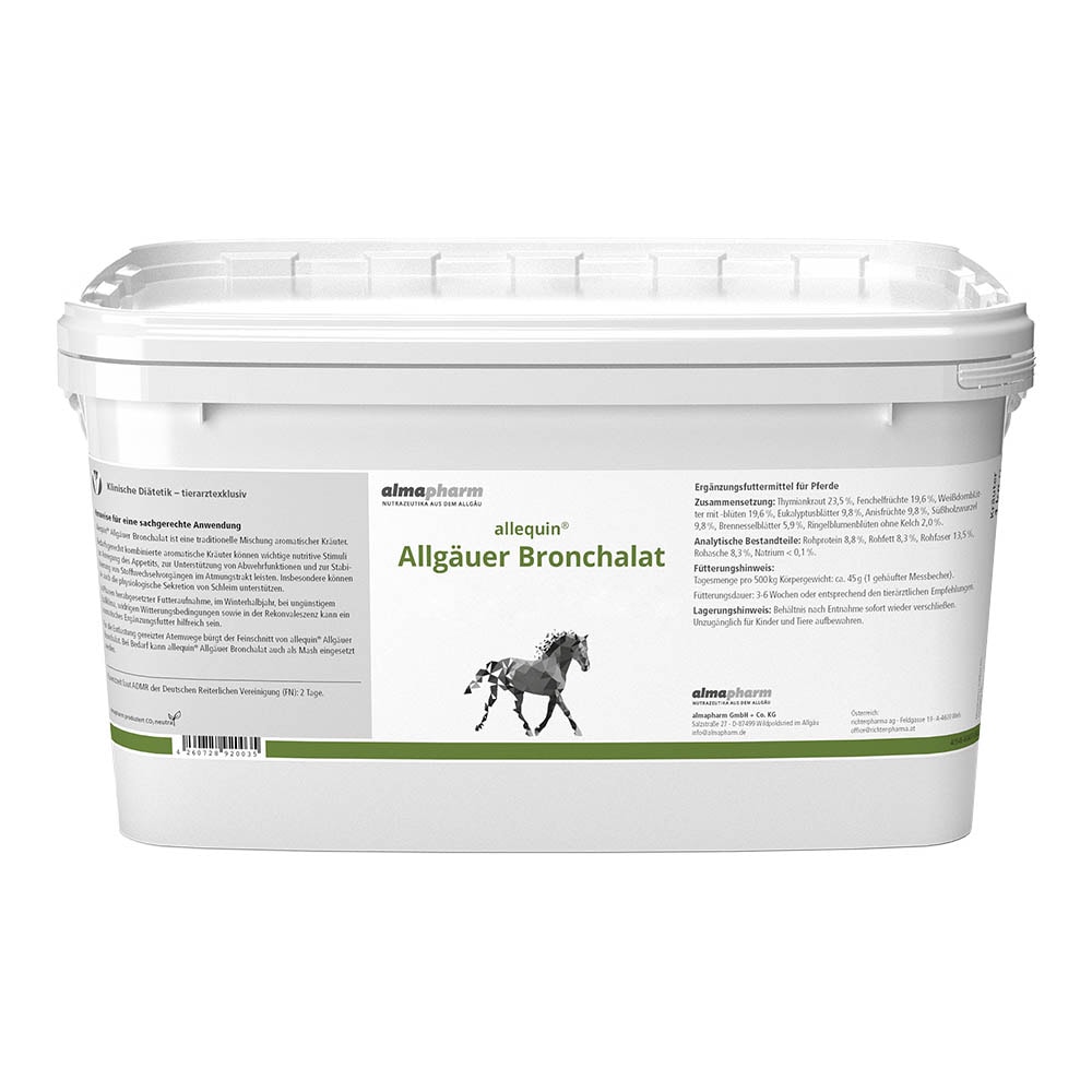 allequin® Allgäuer Bronchalat ist eine traditionelle Mischung aromatischer Kräuter. Bedarfsgerecht kombinierte aromatische Kräuter können wichtige nutritive Stimuli zur Anregung des Appetits, zur Unterstützung von Abwehrfunktionen und zur Stabilisierung von Stoffwechselvorgängen im Atmungstrakt leisten. Insbesondere können sie auch die physiologische Sekretion von Schleim unterstützen. In Phasen herabgesetzter Futteraufnahme, im Winterhalbjahr, bei ungünstigem Stallklima, widrigen Witterungsbedingungen sowie in der Rekonvaleszenz kann ein aromatisches Ergänzungsfutter hilfreich sein. Für die Entlastung gereizter Atemwege bürgt der Feinschnitt von allequin® Allgäuer Bronchalat. Bei Bedarf kann allequin® Allgäuer Bronchalat auch als Mash eingesetzt werden.