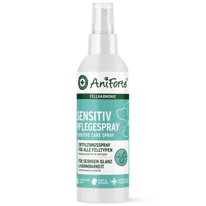 AniForte® Fellharmonie Pflegespray Sensitiv eignet sich für alle Hunde- und Katzenrassen – doch speziell bei langhaarigen Tieren gestaltet sich die Fellpflege manchmal schwierig: Die Haare verfilzen, bilden Knoten und lassen sich nicht mehr schmerzfrei kämmen. Die Lösung für verfilztes Haar ist das Fellspray, welches leistungsstarke und natürliche Inhaltsstoffe wie Aloe Vera, Jojobaöl und Sheabutter vereint. Dadurch wird die Verfilzung Ihres Lieblings auf pflanzliche Weise entwirrt und die Haut mit Feuchtigkeit versorgt.