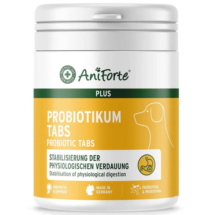 Im Darm ist ganz schön was los! Mit AniForte® plus Probiotic Tabs haben wir ein Synbiotikum entwickelt, das eine optimale Kombination von Probiotika und Präbiotika liefert und speziell auf den empfindlichen Verdauungstrakt Deines Vierbeiners abgestimmt ist. Mit Kurkuma und Beta-Glucan aus wertvollen Hefen wurden gezielt Naturstoffe eingesetzt, um deren immunstärkende Eigenschaften zur Unterstützung des natürlichen Abwehrsystems im Darm des Hundes zu nutzen. Bereichert wird die Rezeptur mit pektinreichem Apfeltrester und Fructo-Oligosaccharide aus der Wurzel der Chicorée gewonnen, die zusätzlich die nützliche Mikroflora im Magen-Darm-Trakt unterstützen.