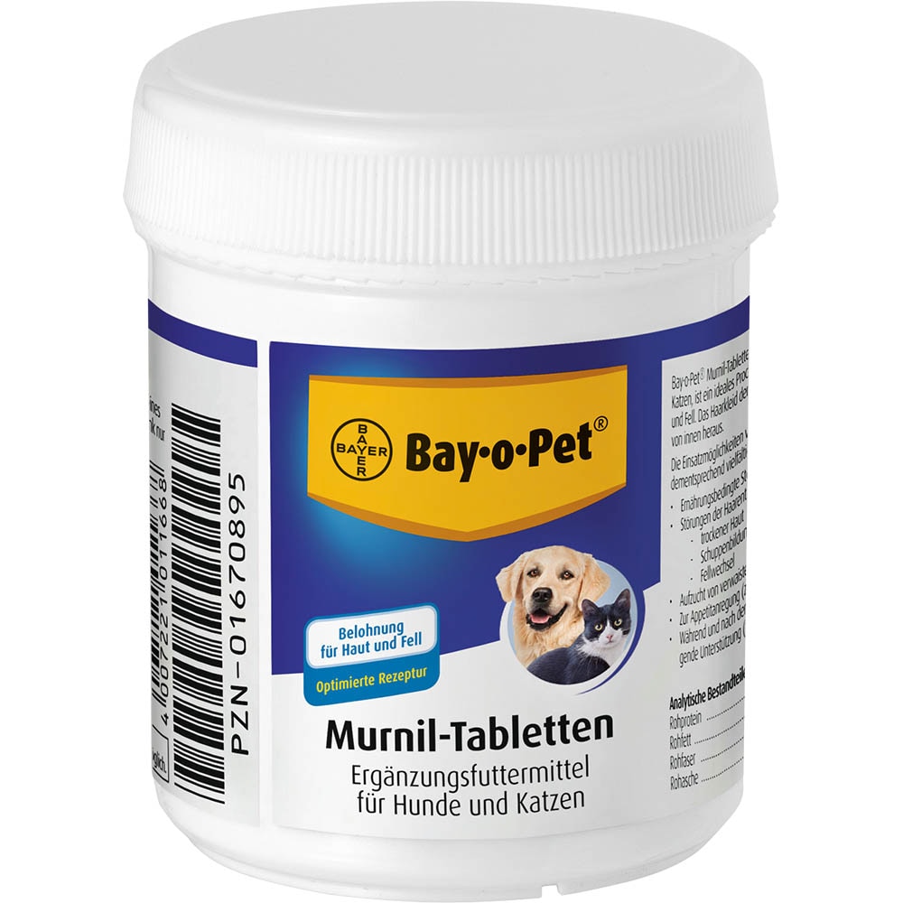 Bay-o-Pet Murnil-Tabletten ist ein ideales, vitamin- und proteinreiches Ergänzungsfuttermittel für Haut und Fell. Das Haarkleid der Tiere wird gekräftigt und erhält neuen Glanz durch Biotin und Vitamine des B-Komplexes. Bay-o-Pet Murnil-Tabletten werden von Hunden und Katzen sehr gerne angenommen und eignen sich daher hervorragend als sinnvolle Ergänzung mit Belohnungscharakter.