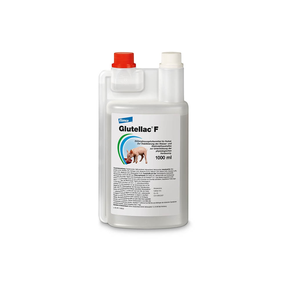 Wasser zur freien Aufnahme sollte zusätzlich zur Verfügung stehen. Die Elektrolytlösung sollte vor jeder Gabe frisch zubereitet werden und in sauberen, flachen Tränkeschalen in der Nähe des Ferkelnestes angeboten werden. Glutellac® F sollte bei Durchfall bis zum Abklingen der klinischen Symptome vertränkt werden, jedoch längstens über 7 Tage.Dauer der Verwendung: