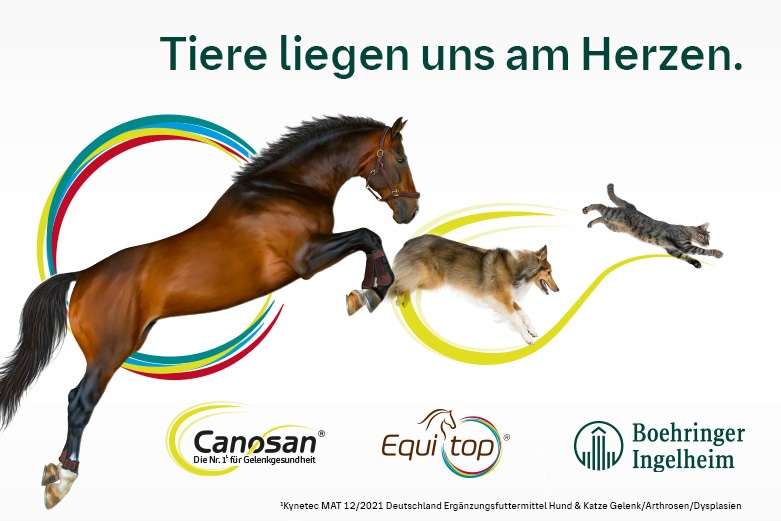 Da unsere Vierbeiner immer länger leben, entwickeln sie oft für den Menschen typische chronische Krankheiten: Auch Hunde, Katzen und Pferde leiden an Arthrose, Magen-Darm-Beschwerden und anderen Erkrankungen. Deshalb steht die Entdeckung und Entwicklung von innovativen Medikamenten für Boehringer Ingelheim an erster Stelle. So gehören bewährte Ergänzungsfuttermittel wie Canosan® für Hunde und Katzen sowie Equitop Gonex® für Pferde mit aktivem Grünlippmuschel-Extrakt zur bestmöglichen Regeneration und Stabilisierung von Knorpeln, Sehnen, Bändern, Gelenkkapseln uvm. zum Sortiment von Boehringer Ingelheim.