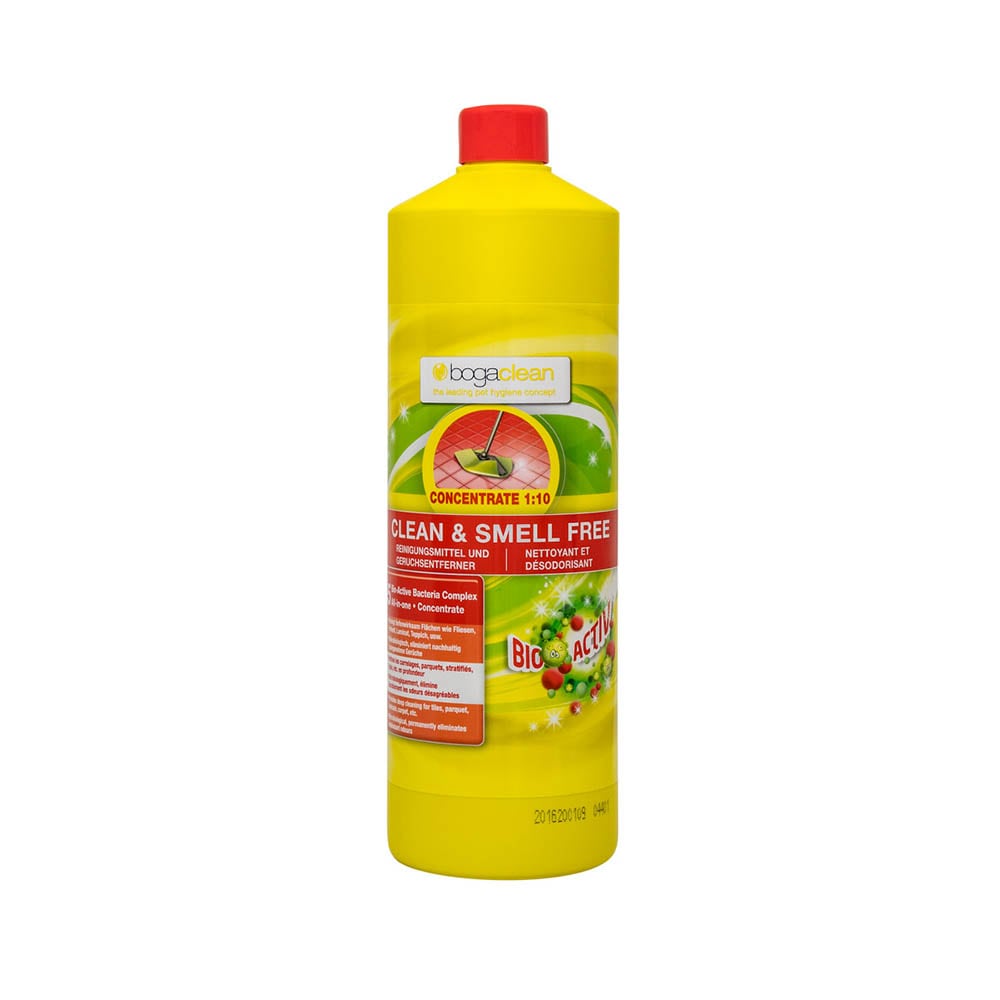 Schlechte Gerüche entstehen beim Abbau von organischem Material durch Bakterien. Dadurch bilden sich übelriechende Gase, Schwefelverbindungen und Ammoniak (Kot, Urin, Erbrochenes, Reviermarkierungen, Inkontinenz usw.). bogaclean® CLEAN & SMELL FREE ist ein hocheffizientes Reinigungsmittel, welches unangenehme, organische Gerüche tiefenwirksam, mikrobiologisch und nachhaltig eliminiert. Den geruchsbildenden Keimen wird der Nährboden entzogen, wodurch schlechter Geruch und erneutes Reviermarkieren verhindert wird.