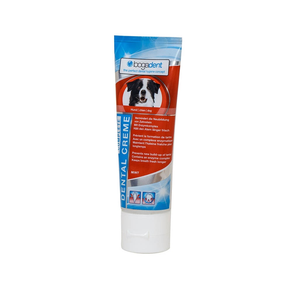 AnwendungsempfehlungGewöhnen Sie Ihren Hund möglichst früh, behutsam und spielerisch an eine effektive Zahn- und Mundhygiene. Benutzen Sie die bogadent® DENTAL CREME COMPLETE für die tägliche Reinigung mit unserer bogadent® ERGO DUAL BRUSH Zahnbürste oder dem bogadent® ANTI-PLAQUE FINGER. Entfernen Sie dazu erst die Alu-Versiegelung von der Tubenspitze und tragen Sie etwas bogadent® DENTAL CREME COMPLETE auf die Zahnbürste auf. Dann heben Sie die Lefzen an und reinigen Sie die Außenflächen und Innenflächen der Eck- und Backenzähne mit gleichmäßig kreisenden Bewegungen und sanftem Druck.