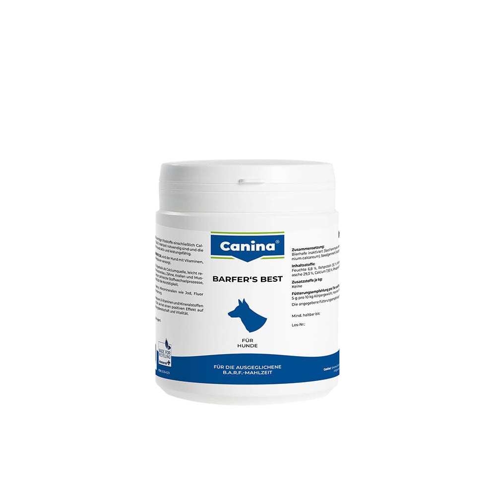 Canina® BARFER´S BEST beinhaltet alle Vitamine und Mineralstoffe natürlichen Ursprungs, einschließlich Calcium, die der mit Rohfleisch gefütterte Hund täglich benötigt, um seinen Bedarf zu decken und um leistungsfähig und aktiv zu bleiben. In Kombination mit Canina® BARFER´S OIL (zur Versorgung mit essentiellen Fettsäuren) wird der "gebarfte" Hund optimal ernährt. Zusammen mit Canina® BARFER'S OIL ist die B.A.R.F.-Mahlzeit für den wachsenden Hund komplett.