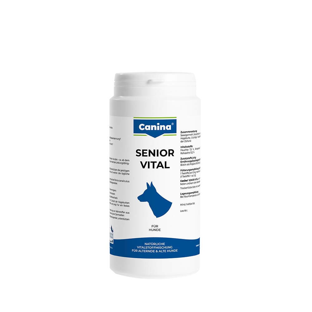 Beim alten und alternden Hund (Hunde ab dem 7. Lebensjahr) lassen Kondition, körperliche und mentale Leistungsfähigkeit nach; alle Stoffwechselprozesse verlangsamen sich. Hunde großer Rassen altern früher als Hunde kleiner Rassen. SENIOR VITAL ist eine natürliche Vitalstoffmischung mit Vitaminen, Mineralstoffen und Spurenelementen, die den Senior- Hund körperlich und geistig unterstützt.