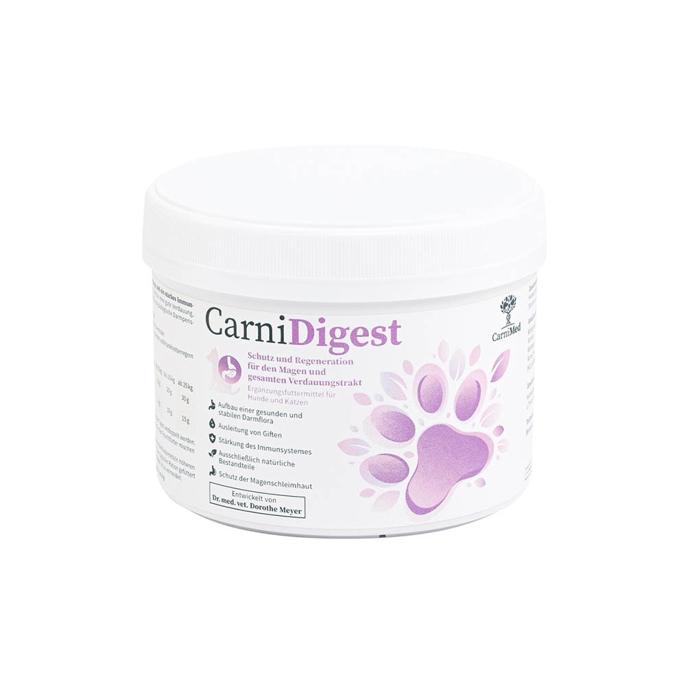 Die besondere Stärke von CarniDigest liegt in seiner einzigartigen Zusammensetzung natürlicher Bestandteile. Glutenfreie ß-Glukane, Heilerden, Fruktooligosaccharide und Mannanoligosaccharide, Aminosäuren und Süßholz könne zusammen wirken, um die Darmflora aufzubauen und die Schleimhäute zu regenerieren. Zusätzlich können Inhaltsstoffe wie Rotalge, L-Threonin und Lecitin für die Aufnahme überschüssiger Magensäure im Hundemagen sorgen und können schleimhautschützende Effekte haben.Vorteile- Allergiker geeignet