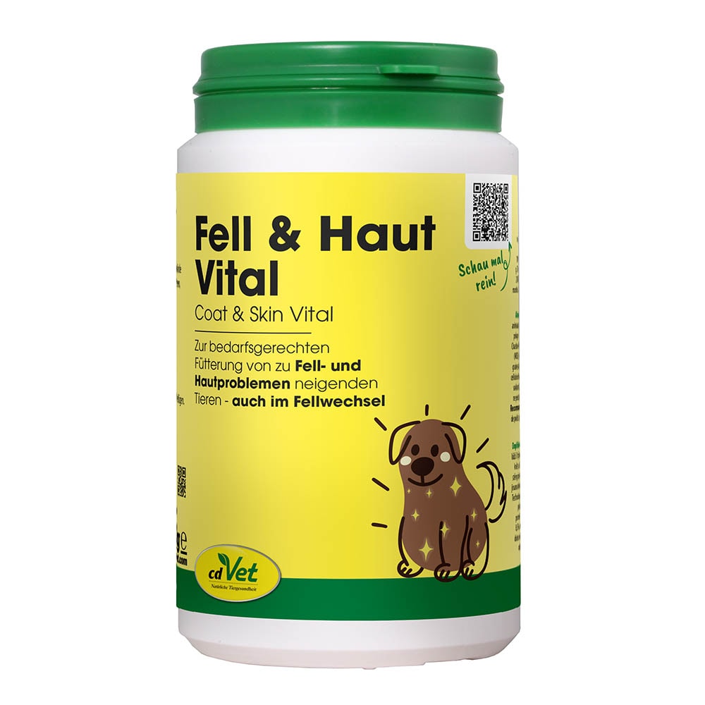 Fell & Haut Vital ist ein rein natürliches Ergänzungsfuttermittel zur intensiven Unterstützung des Organismus bei stumpfen und trockenem Fell, Haarbruch und Haarverlust, Schuppen und anderen Hautirritationen, die oft Folgen von Stress und Mangelsituationen, sowie Belastungen durch synthetische Stoffe sind. Fell & Haut Vital besteht aus speziellen Kräutern, Hefen, essentiellen Fettsäuren, Mikronährstoffen, Spurenelementen und Vitaminen, die dabei helfen ernährungsbedingte Defizite auszugleichen und somit für eine optimale Kondition der Entgiftungsorgane sorgen.