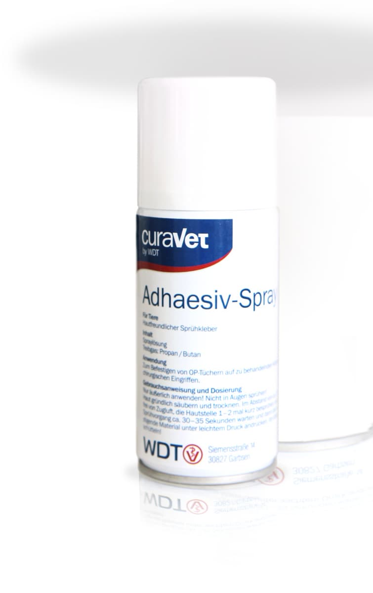 Adhäsiv-Sprühkleber zum Aufbringen auf die Haut. Zur sicheren Fixation von OP-Folien oder, um das Verrutschen von Verbänden zu verhindern.