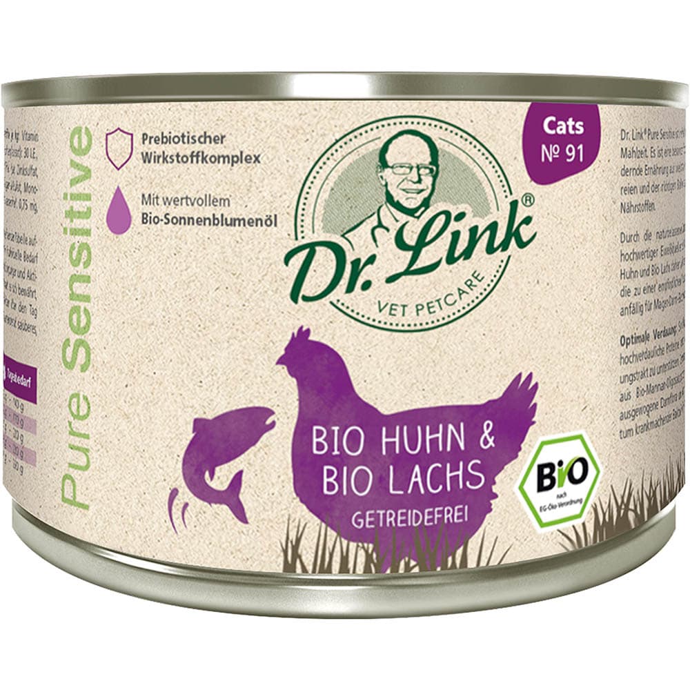 Durch die naturbelassenen Zutaten sowie die Nutzung hochwertiger, tierischer Eiweißquellen ist Dr. Link® Pure Sensitive Bio Huhn und Bio Lachs daher auch bestens für Katzen geeignet, die zu einer empfindlichen Verdauung neigen und deshalb anfällig für Magen-Darm-Beschwerden sind.Optimale Verdauung: