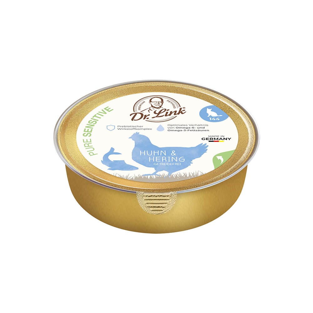 Dr. Link® Pure Sensitive Huhn und Hering ist eine besonders hochwertige Ernährung aus viel frischem Fleisch, Fisch, Innereien und wertvollen Ölen sowie der richtigen Balance aus sorgfältig ausgewählten Nährstoffen. Durch die Nutzung hochwertiger tierischer Eiweißquellen ist Dr. Link® Pure Sensitive Huhn und Hering daher auch bestens für Katzen geeignet, die zu einer empfindlichen Verdauung neigen.