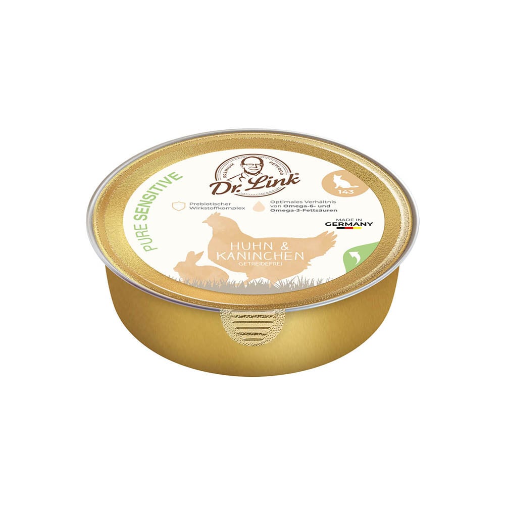 Dr. Link® Pure Sensitive Huhn und Kaninchen ist eine besonders hochwertige Ernährung aus viel frischem Fleisch, Innereien und wertvollen Ölen sowie der richtigen Balance aus sorgfältig ausgewählten Nährstoffen. Durch die Nutzung hochwertiger tierischer Eiweißquellen ist Dr. Link® PURE SENSITIVE Huhn und Kaninchen daher auch bestens für Katzen geeignet, die zu einer empfindlichen Verdauung neigen.