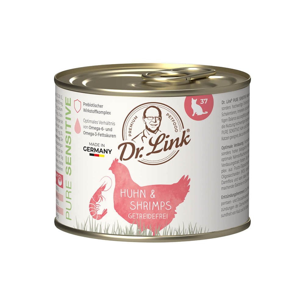 Dr. Link® Pure Sensitive Huhn und Shrimps ist eine besonders hochwertige Ernährung aus viel frischem Fleisch, Fisch, Innereien und wertvollen Ölen sowie der richtigen Balance aus sorgfältig ausgewählten Nährstoffen. Durch die Nutzung hochwertiger tierischer Eiweißquellen ist Dr. Link® PURE SENSITIVE Huhn und Shrimps daher auch bestens für Katzen geeignet, die zu einer empfindlichen Verdauung neigen.