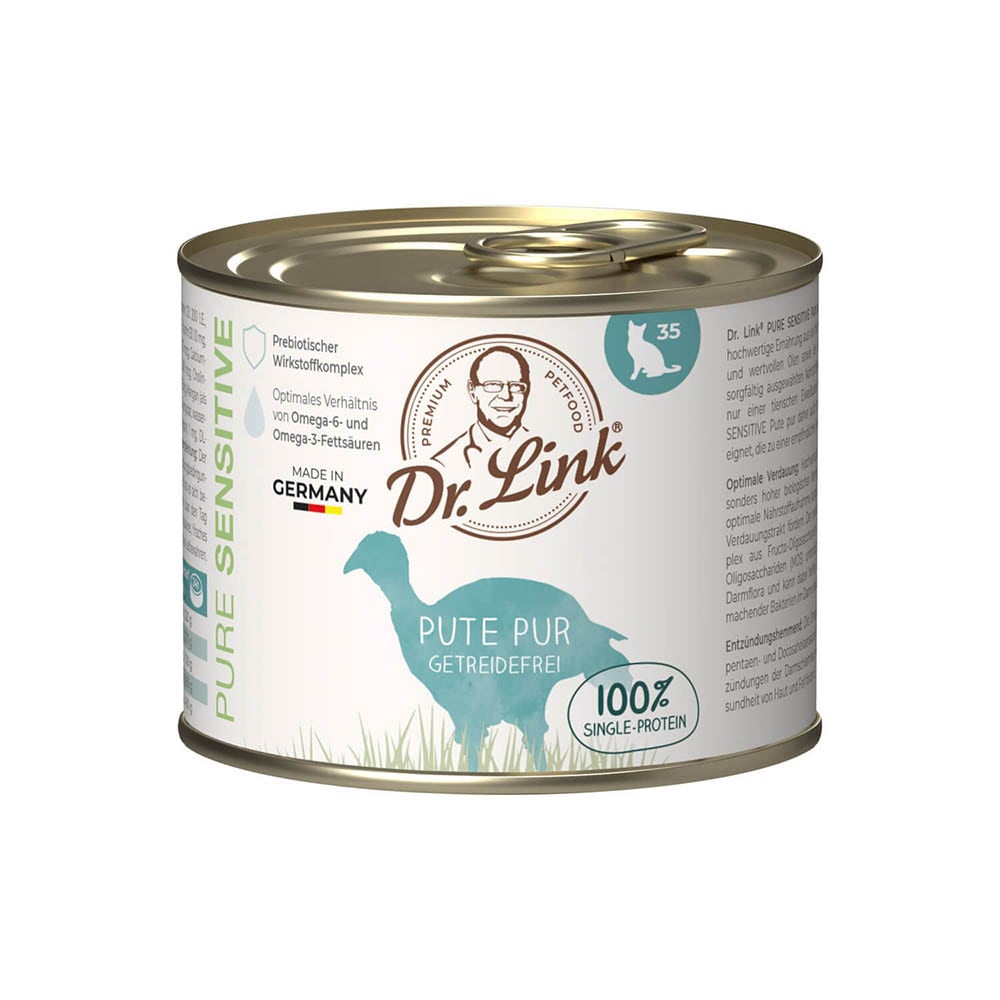 Dr. Link® Pure Sensitive Pute pur ist eine besonders hochwertige Ernährung aus viel frischem Fleisch, Innereien und wertvollen Ölen sowie der richtigen Balance aus sorgfältig ausgewählten Nährstoffen. Durch die Nutzung hochwertiger tierischer Eiweißquellen ist Dr. Link® Pure Sensitive Pute pur daher auch bestens für Katzen geeignet, die zu einer empfindlichen Verdauung neigen.