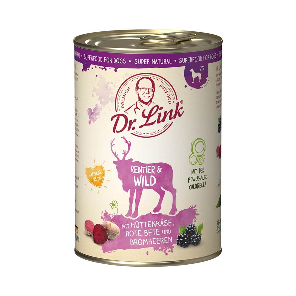Die Hunde-Mahlzeit mit Super-Power. Gemacht für unsere kleinen Helden des Alltags. Unsere schmackhaften Menüs sind schonend zubereitet, damit alle unsere Super-Zutaten auch ihre heldenhafte Wirkung beibehalten. Wild und Rentier mit Hüttenkäse, Rote Bete und Brombeeren: Bei diesem Menü wird selbst der anspruchsvollste Hund in der Hütte verrückt. Saftiges Wild und Rentier, dazu bekömmlicher Hüttenkäse, vitalstoffreiche Rote Bete und leckere Brombeeren. Was so gut schmeckt, hat definitiv Suchtpotential.