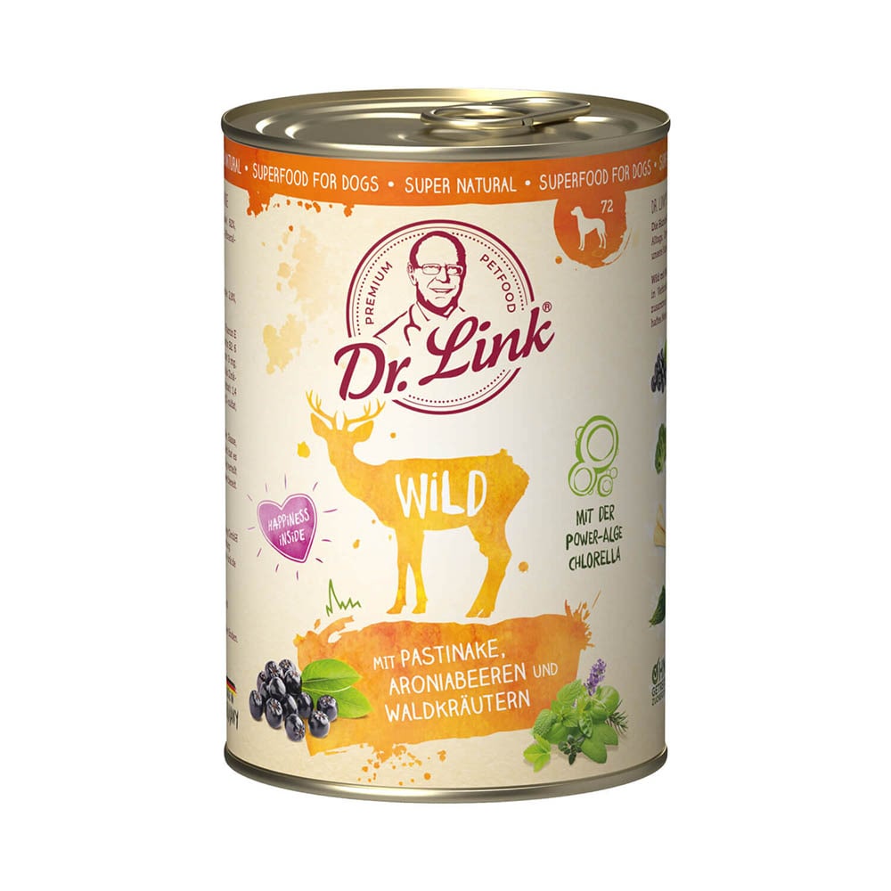 Wild (Fleisch und tierische Nebenerzeugnisse): 62%, Fleischbrühe: 28,7%, Pastinake: 4%, Brokkoli: 2%, Aroniabeeren: 2%, Mineralstoffe: 1%, Waldkräuter: 0,1%, Chlorella: 0,1%, Lachsöl: 0,1%