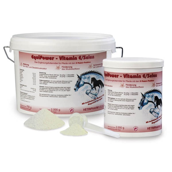 EquiPower - Vitamin E bietet einen optimalen Schutz der Muskelfasern durch Vitamin E sowie Selen und fördert den Muskelaufbau durch die essenzielle Aminosäure Lysin. Vitamin E verbessert den Muskelstoffwechsel, erhöht die Rittigkeit sowie die Belastbarkeit und steigert die Leistungsbereitschaft. Zusätzlich wird der Aufbau von Körpersubstanz optimiert, die Muskelneubildung gefördert und die Muskulatur in Ruhephasen besser erhalten.