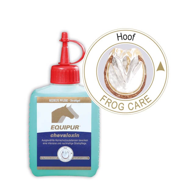 EQUIPUR - chevaloxin wirkt am Strahl, in der Strahlfurche sowie in der weißen Linie trocknend und schützend. Schleppersubstanzen sorgen für ein tiefes und kraftvolles Eindringen der Wirkstoffe; dabei halten spezielle Pflegezusätze das Horn elastisch und unterstützen die Hornneubildung.