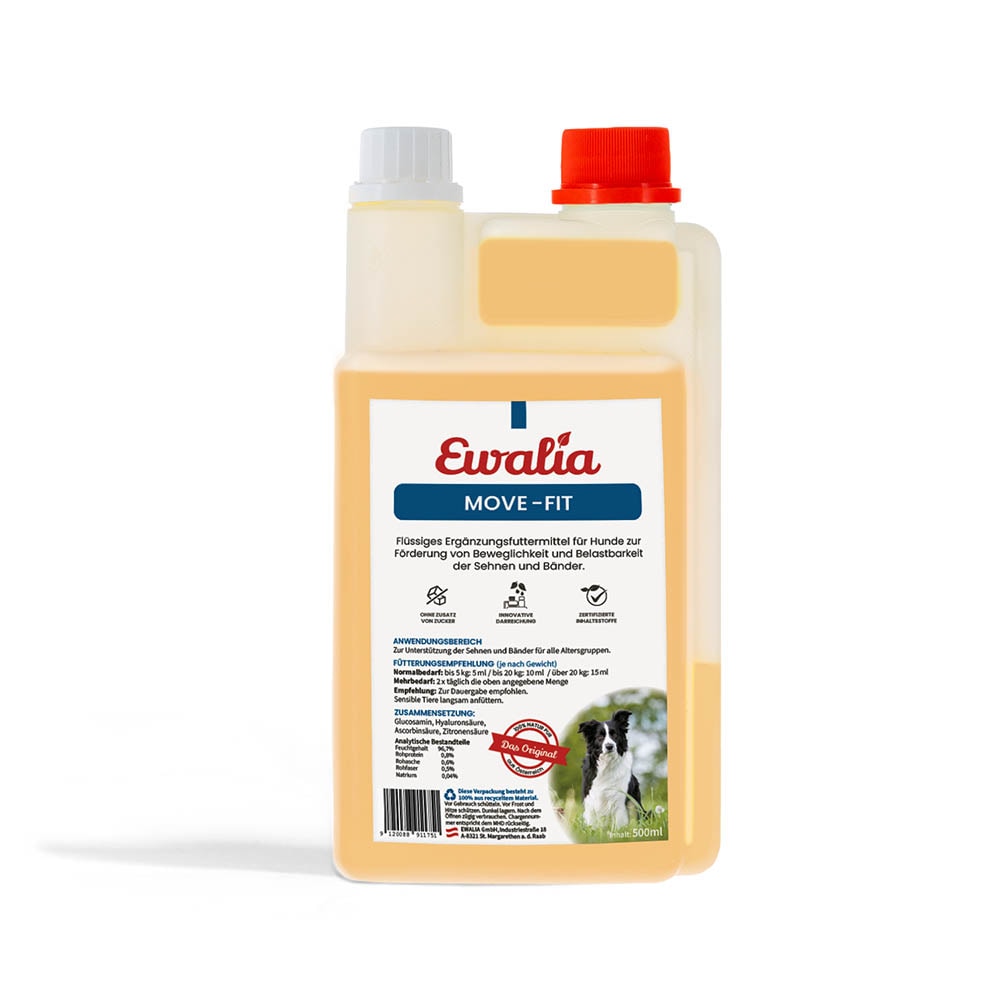 Unser Move-Fit ist ein weiteres flüssiges Ergänzungsfuttermittel, das speziell entwickelt wurde, um die Belastbarkeit der Sehnen und Bänder eurer Hunde zu fördern. Es ist perfekt geeignet für aktive Hunde, die besonderen Beanspruchungen ausgesetzt sind. Die einzigartige Kombination der enthaltenen Inhaltsstoffe bietet optimale Unterstützung. Auch ältere Hunde kommen mit dem Move-Fit wieder in Bewegung, da die enthaltenen Inhaltsstoffe auch den altersbedingten Verschleiß der Sehnen und Bänder bremsen können. Es kann auch bei der Genesung von Verletzungen oder nach Operationen unterstützen, um wieder in Schwung zu kommen.