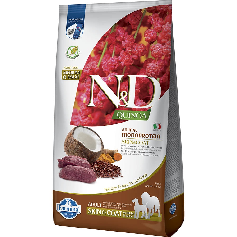 N&D Quinoa Skin & Coat ist ein Diät-Alleinfuttermittel für Hunde, zur Minderung von Ausgangserzeugnis- und Nährstoff Intoleranzerscheinungen. Fütterungsempfehlung: Es wird empfohlen, vor der Verwendung und vor Verlängerung der Fütterungsdauer den Rat eines Tierarztes einzuholen.