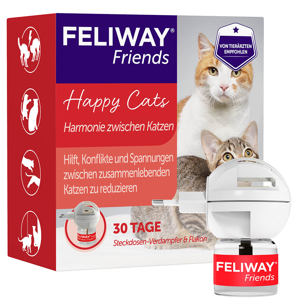 FELIWAY® FRIENDS ist eine synthetische Kopie von diesem Pheromon und hat den gleichen besänftigenden Effekt auf Katzen jeden Alters. Wissenschaftlich belegt, hilft FELIWAY® FRIENDS die Spannungen und Konflikte im Mehrkatzenhaushalt zu reduzieren.Das Wichtigste zum FELIWAY® FRIENDS Start-Set im Überblick:
