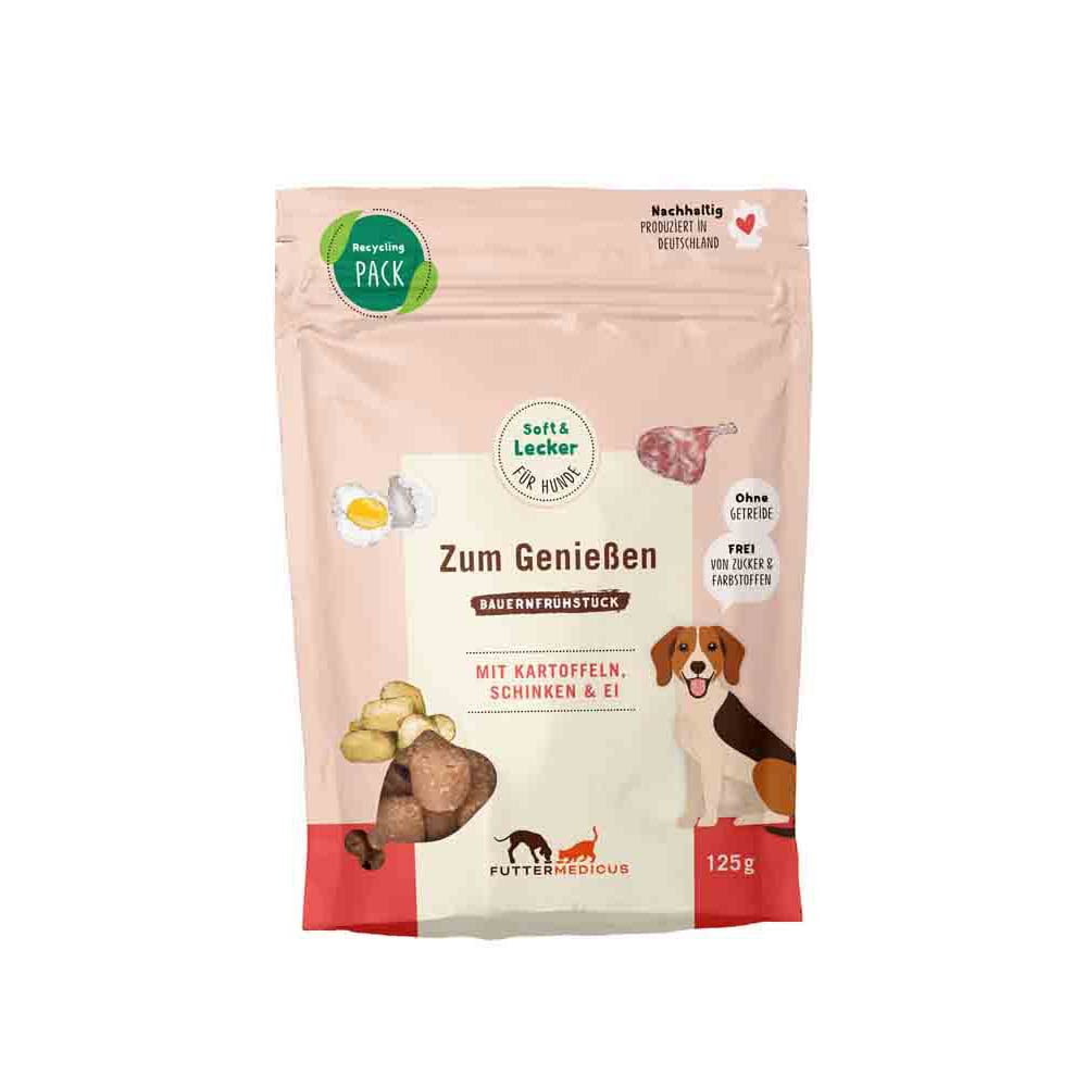- Softsnack für Hunde - saftig & lecker mit Kartoffel, Schinken und Vollei. Futtermedicus Bauernfrühstück ergibt zusammen mit Schinken, Eier und Kartoffeln eine super leckere Belohnung. In der geschlossenen Tüte bleibt der Snack schön weich. Auch für Allergiker geeignet. Futtermedicus Bauernfrühstück – ein Geschmackserlebnis für Ihren Liebling. Futtermedicus Bauernfrühstück ist, ohne Getreide, ohne Zucker, ohne Konservierungsstoffe, nachhaltig produziert und in 100% recyclebarer Tüte verpacktEin kulinarischer Gaumenschmauß als Belohnung beim Training oder einfach zwischendurch, mit einer extra Portion Natürlichkeit.