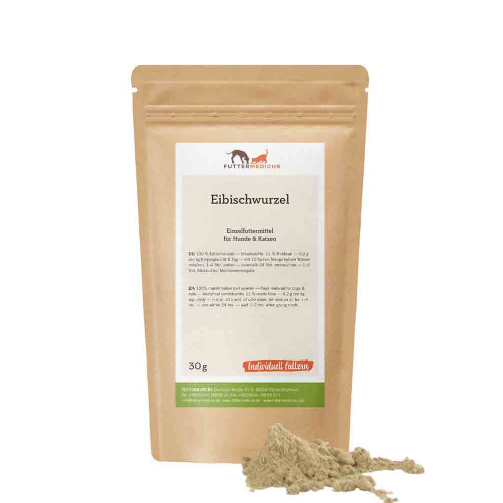 • Eibischwurzel ist eine Nahrungsergänzung für Hunde und Katzen. Das Pulver wird mit Wasser zu einer schleimigen Substanz angerührt. Dieser Schleim ist gut zur Unterstützung der Magenfunktion verwendbar.
