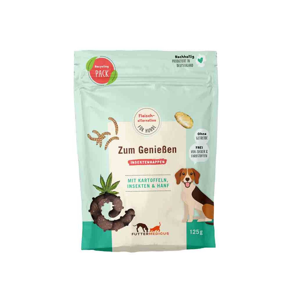 - Softsnack für Hunde - saftig & lecker mit Kartoffeln, Insekten & HanfFuttermedicus Insektenhappen ergeben zusammen mit Mehlwürmern, Kartoffeln und Hanf eine super leckere Belohnung. Gerade für empfindliche Hunde stellen Mehlwürmer eine alternative Proteinquelle darf. Durch ihren leicht nussigen Geschmack ähneln Sie Sonnenblumenkernen. In der geschlossenen Tüte bleibt der Snack schön weich. Auch für Allergiker geeignet.Futtermedicus Insektenhappen – ein Geschmackserlebnis für Ihren LieblingEin kulinarischer Gaumenschmauß als Belohnung beim Training oder einfach zwischendurch, mit einer extra Portion Natürlichkeit.