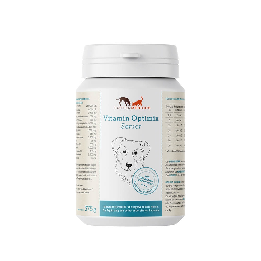 • Seniorengerechte BARF- oder Kochration – mit Vitamin Optimix Senior. Die Nahrungsergänzung für alte Hunde - Vitamin Optimix Senior - ergänzt selbstgekochtes Hundefutter mit allen notwendigen Vitaminen und Mineralien für den Hundesenior. Das Mineralstoffvitaminpulver ist abgestimmt auf den Bedarf älterer Hunde mit einem Plus an B-Vitaminen, Zink und Vitamin E. Knochen- und Innereienfütterung ist nicht notwendig.
