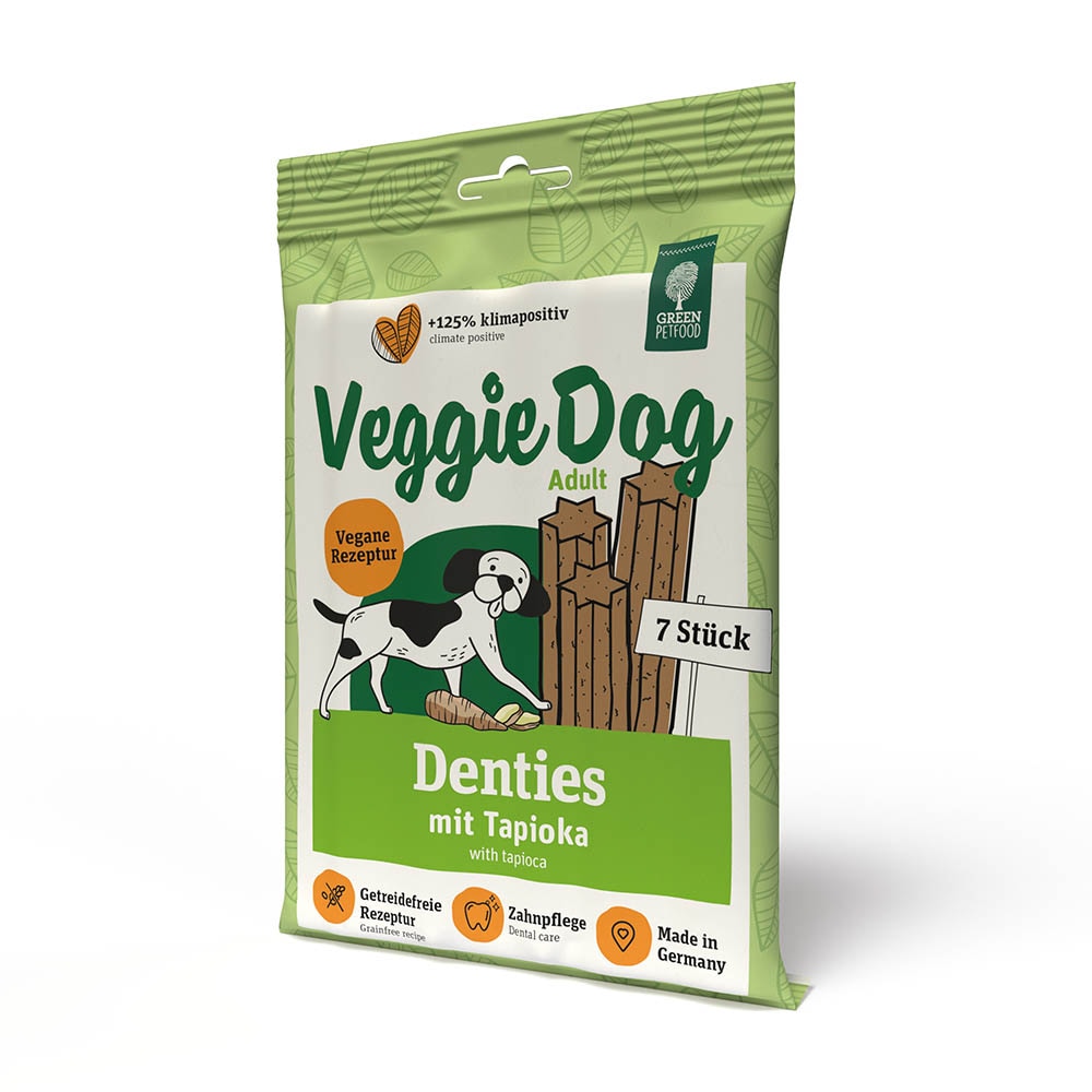 Was Zahnpflege und Weltrettung vereint? Unsere neuen Green Petfood VeggieDog Denties für Deine Fellnase! Die getreidefreien Dentasticks sind die perfekte Ergänzung zu unserem beliebten VeggieDog – was ihnen auch zu ihrem Namen verholfen hat. Das Besondere: Die Denties sind sogar 100 % vegan! Wir haben sie gemeinsam mit Ernährungswissenschaftler:innen und Tierärzt:innen entwickelt – in Deutschland und nur mit allerbesten Zutaten. Heraus kam ein grüner Superheld, der mit seiner sternförmigen Struktur das Kauen fördert und sich dank Cellulose hervorragend zur Unterstützung der täglichen Zahnhygiene eignet – Zahnfleischmassage inklusive!