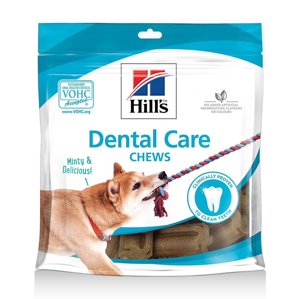 Hill's Dental Care Chews sind schmackhafte, gesunde Belohnungssnacks für Hunde, die klinisch erwiesen die Zähne reinigen und gesundes Zahnfleisch fördern. Mit einer speziellen Form und einer härteren Konsistenz, die hilft, die Zähne zu reinigen und den Atem zu erfrischen. Wirkt wie eine Zahnbürste und Zahnseide in einem!