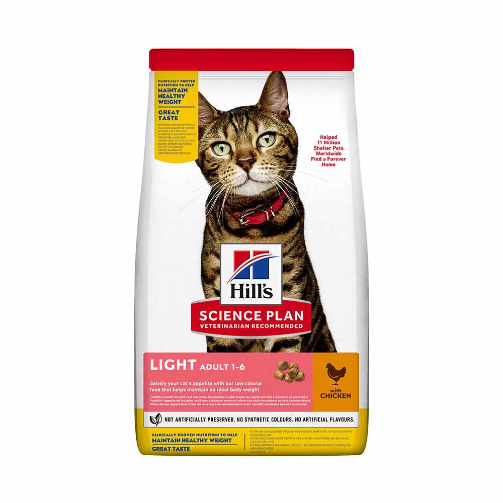 Hill's™ Science Plan™ Feline Adult Light Trockenfutter für Katzen, Geschmacksrichtung Huhn, mit L-Carnitin und weniger Kalorien für ein optimales Gewichtsmanagement bei erwachsenen Katzen. Voll an hochwertigem Protein, Omega-6-Fettsäuren und Vitamin E für glänzendes Fell und gesunde Haut. Hat Ihre Katze ein merkliches Gewichtsproblem? Oder möchten Sie einfach dafür sorgen, dass Ihr vierbeiniger Freund ein gesundes Gewicht hält? HILL'S SCIENCE PLAN Light Adult Trockenfutter für Katzen liefert weniger aktiven erwachsenen Katzen eine exakt abgestimmte, kalorienreduzierte Ernährung. Dieses Katzenfutter, hergestellt mit hochwertigen Zutaten, hat im Vergleich zu HILL'S SCIENCE PLAN Adult Katzenfutter 17 % weniger Kalorien, enthält L-Carnitin und unterstützt ein ideales Gewicht bei Ihrer erwachsenen Katze. Das hochwertige Protein und die natürlichen Fasern helfen Ihrer Katze, sich zwischen den Mahlzeiten satt und zufrieden zu fühlen. Vitamin E und Omega-6-Fettsäuren fördern ein glänzendes Fell und versorgen die Haut.