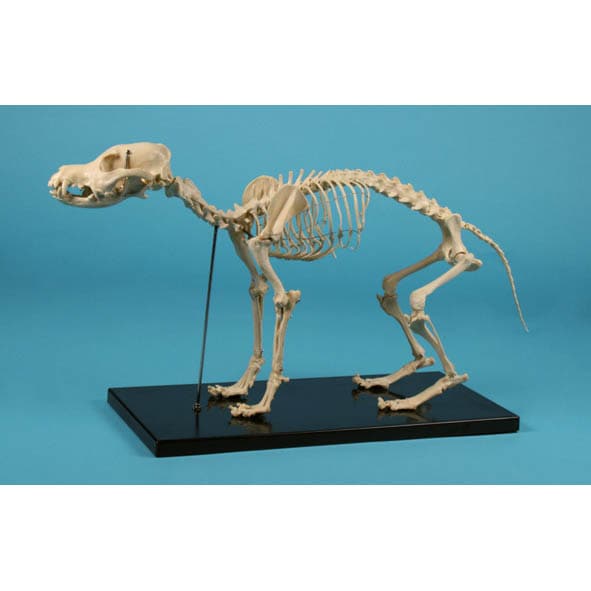 Das mittelgroße Hundeskelett ist der Kunststoff-Abguss des Skeletts eines kleinen Hundes (wie z.B. Jack Russell Terrier oder Zwergpudel). Das Hundeskelett ist zerlegbar und hat einen beweglichen Kiefer.