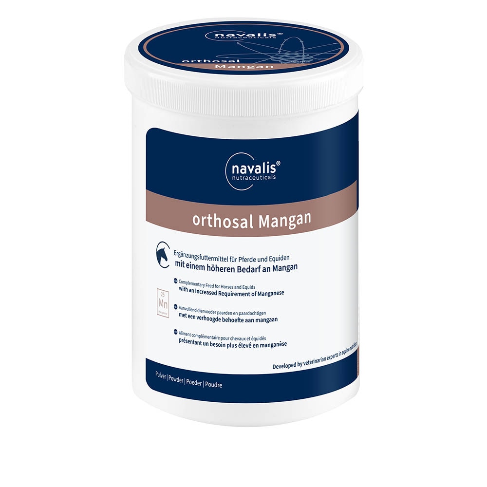 Als Cofaktor vieler Enzymsysteme schützt Mangan vor freien Radikalen und nimmt im Stoffwechsel der Fette, Kohlenhydrate und Aminosäuren eine wichtige Funktion ein. Mangan ist damit essentieller Baustein für ein gesundes Knochen- und Knorpelwachstum sowie für den Muskel- und Sehnenstoffwechsel. Der wichtigste Grund für einen Mangel ist die schlechte Resorbierbarkeit von nur ca. 1 % des im Futter enthaltenen Mangans.Anwendungsgebiete: