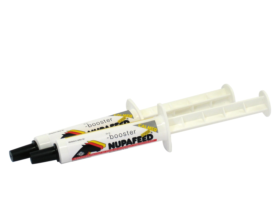 Nupafeed® booster ist die "Magnesiumpaste" für das Pferdemaul. Der handliche Maulinjektor enthält MAH® in höherer Dosierung und wurde speziell für den Turniersport entwickelt. Wichtig ist, dass der Nupafeed® booster rechtzeitig verabreicht wird, denn es dauert eine gewisse Zeit, bis die Magnesiumspeicher im Organismus optimal gefüllt sind. Also nicht erst warten, bis die Pferde bereits übererregt und gestresst sind. Auf längere Sicht empfiehlt es sich, die Magnesiumspeicher mit Nupafeed® liquid aufzufüllen. Nupafeed® booster ist Ihr Produkt für die kurzfristige und hochdosierte Magnesiumzufuhr mit organischem Magnesiumaspartat-hydrochlorid (MAH®).