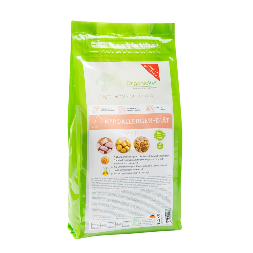 OrganicVet Hypoallergen-Diät ist ein hochwertiges Alleinfuttermittel für Katzen mit Futtermittelallergien und -Unverträglichkeiten.