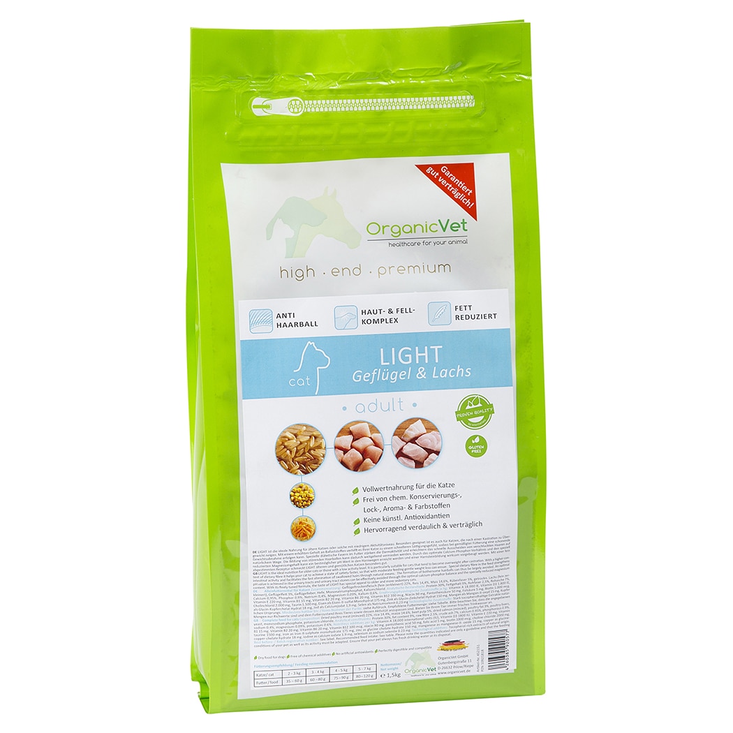 OrganicVet Light Geflügel & Lachs hilft mit einem erhöhten Gehalt an Ballaststoffen Ihrer Katze zu einem schnelleren Sättigungsgefühl, sodass bei gemäßigter Fütterung eine schonende Gewichtsabnahme erfolgen kann.