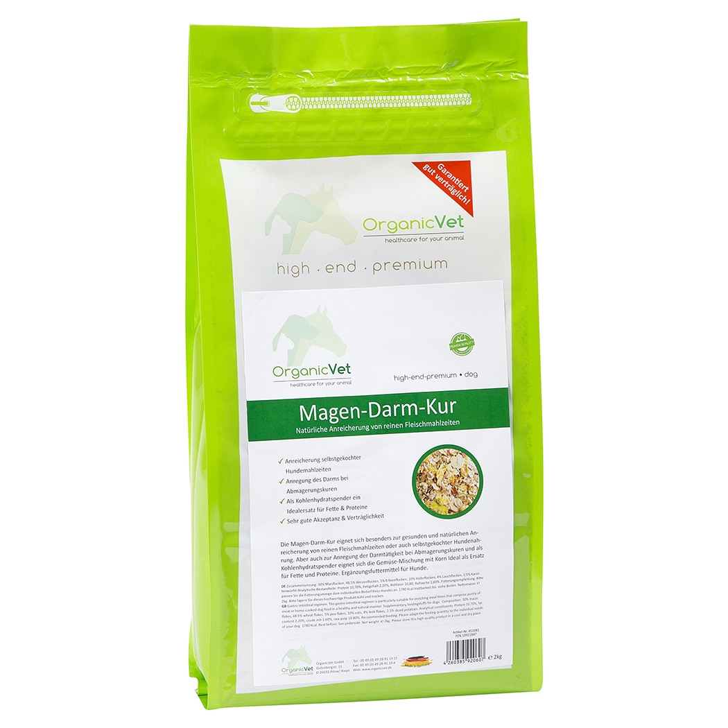 Die Magen-Darm-Kur eignet sich besonders zur gesunden und natürlichen Anreicherung von reinen Fleischmahlzeiten oder auch selbstgekochter Hundenahrung.