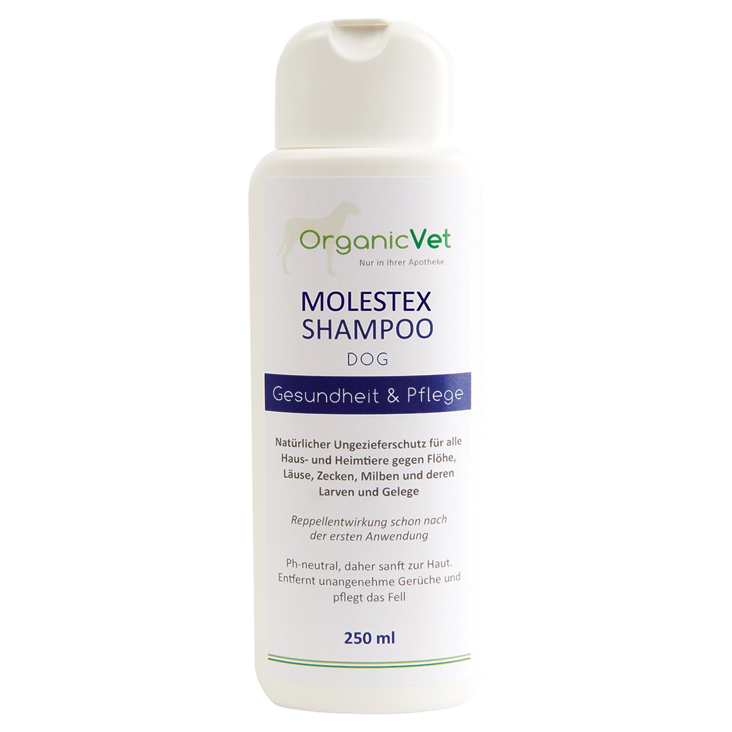 MOLESTEX-SHAMPOO ist ein natürlicher Ungezieferschutz für alle Haus- und Heimtiere gegen Flöhe, Läuse, Zecken, Milben, deren Larven und Eigelege. Die Repellentwirkung (Abschreckung, Vertreibung) erfolgt schon nach der ersten Anwendung.