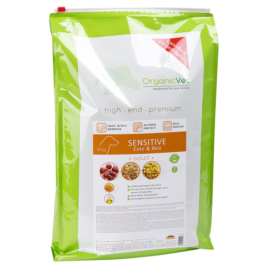 Besonders zu empfehlen ist OrganicVet Sensitive für empfindliche Hunde sowie für Hunde, die aufgrund allergischer Reaktionen oder Futtermittelunverträglichkeiten auf nur einen Proteinträger (reines schonend zubereitetes Entenfleisch) umgestellt werden müssen.Als Kohlenhydratträger wurde in OrganicVet Sensitive bewusst kein Weizen, sondern bekömmlicher Reis und Mais verarbeitet. Die Bierhefe unterstützt zudem mit ihren wichtigen Inhaltsstoffen, wie Aminosäuren, die Haut des Hundes.