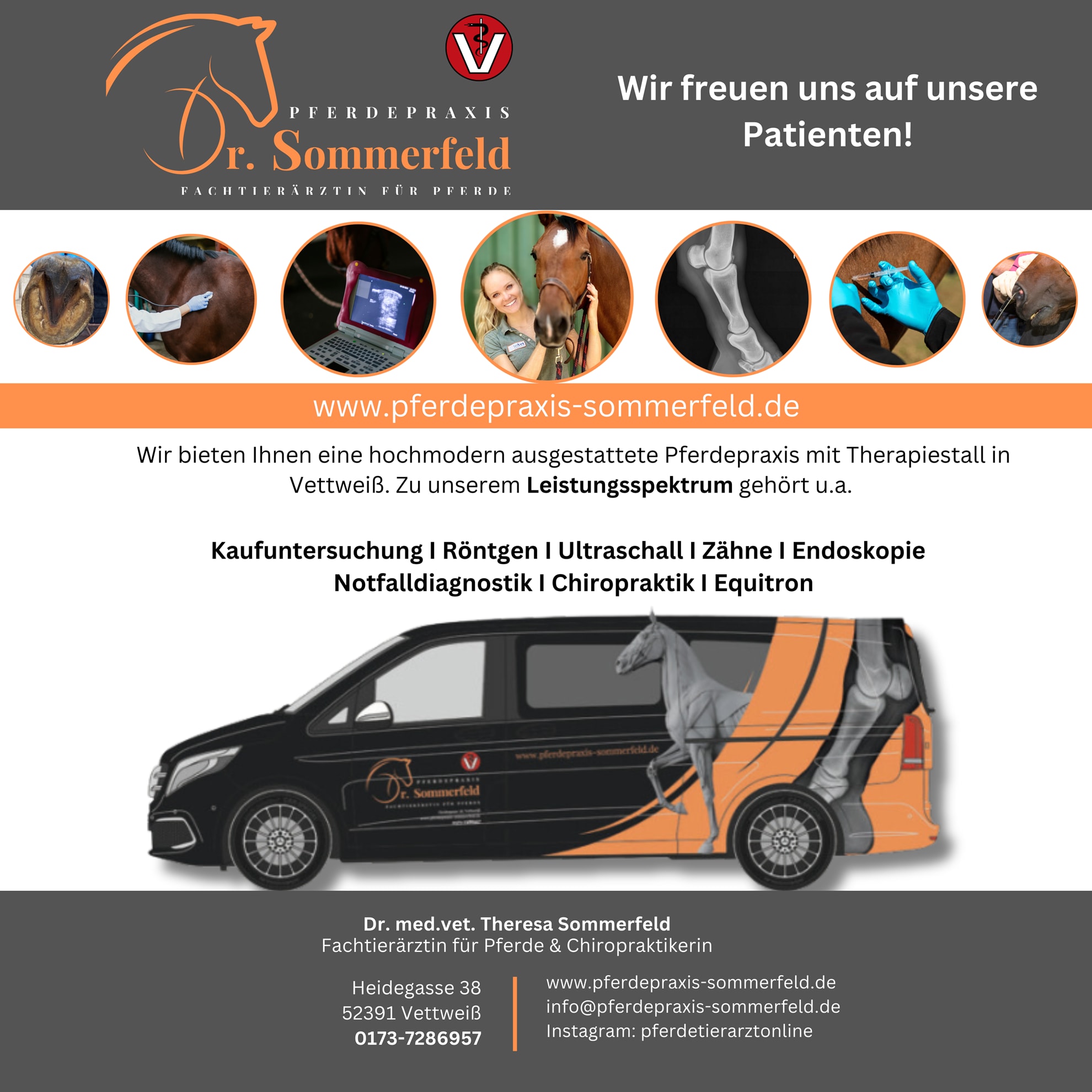 Willkommen in der Pferdepraxis Dr.Sommerfeld! Wir bieten grandiose Pferdemedizin mobil bei Ihnen am Stall und stationär im eigenen Therapiestall. Wir sind eine hochmodern ausgestattete Pferdepraxis mit neusten Geräten (Röntgen, Ultraschall, Endoskopie, Equitron) und können dank jahrelanger Expertise Arbeit auf hohem medizinischem Niveau anbieten. Termine sind am besten telefonisch unter 01737286957 oder auf der Website über das Kontaktformular zu vereinbaren. Wir freuen uns auf Ihren Anruf! Ihre Dr. Theresa Sommerfeld, Fachtierärztin für Pferde