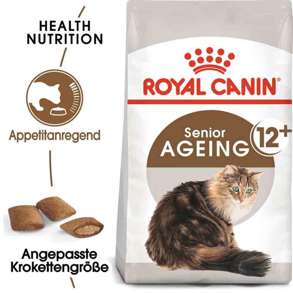 - Warum ein besonderes Futter für Katzen ab 12 Jahren?Alternde Katzen haben andere Ernährungsbedürfnisse als junge Kätzchen. Deshalb ist es wichtig, die Ernährung der Katze mit zunehmendem Alter anzupassen. So kann sichergestellt werden, dass ihre Bedürfnisse erfüllt werden. Einige Senior-Katzen erleben mit zunehmendem Alter ein Nachlassen ihres Geschmacks- und Geruchssinns, was typischerweise zu Appetitlosigkeit und damit zu einer geringeren Nahrungsaufnahme führen kann. ROYAL CANIN Senior Ageing 12+ enthält sehr schmackhafte Kroketten mit einer doppelten Textur (außen knusprig, innen weich), die den Appetit älterer Katzen anregen.ROYAL CANIN Senior Ageing 12+ ist ideal für Katzen ab einem Alter von 12 Jahren geeignet.Die Katzennahrung ist speziell auf die besonderen Bedürfnisse bei der Ernährung älterer Katzen abgestimmt.In den Jahren der natürlichen Alterungsphase benötigen Senior-Katzen eine Nahrung, die ganz bestimmte Nährstoffe zur Aufrechterhaltung ihrer Gesundheit enthält. Aus diesem Grund beinhaltet ROYAL CANIN Senior Ageing 12+ einen Antioxidanzienkomplex, der Katzen während ihres gesamten Alterungsprozesses unterstützt. Dank eines moderaten Phosphorgehalts wird zudem eine gesunde Nierenfunktion unterstützt, was insbesondere bei älteren Katzen ein sehr wichtiger Aspekt ist.ROYAL CANIN Senior Ageing 12+ -Futter hat zudem einen sorgfältig entwickelten, ausgewogenen Mineralstoffgehalt. Dies hilft, die allgemeine Gesundheit der Harnwege der Katze im höheren Alter zu erhalten.Für mehr Abwechslung: Weitere ProduktvariationenUm den individuellen Vorlieben jeder Katze gerecht zu werden, ist ROYAL CANIN Senior Ageing 12+ auch als saftige Stückchen in Soße oder Gelee erhältlich. Wenn Sie eine gemischte Fütterung von Trocken- und Nassfutter in Betracht ziehen, befolgen Sie einfach unsere Fütterungsrichtlinien. So stellen Sie sicher, dass Ihre Katze die richtige Menge an Nass- und Trockenfutter erhält.ROYAL CANIN QualitätsversprechenAlle ROYAL CANIN Produkte durchlaufen eine umfassende Qualitätskontrolle, um eine optimale Futterqualität zu gewährleisten und den individuellen Ernährungsbedürfnissen sowie dem Lebensstil Ihrer Katze gerecht zu werden. Das bedeutet, mit ROYAL CANIN Senior Ageing 12+ bieten Sie Ihrer Katze eine hochwertige und ausgewogene Ernährung.