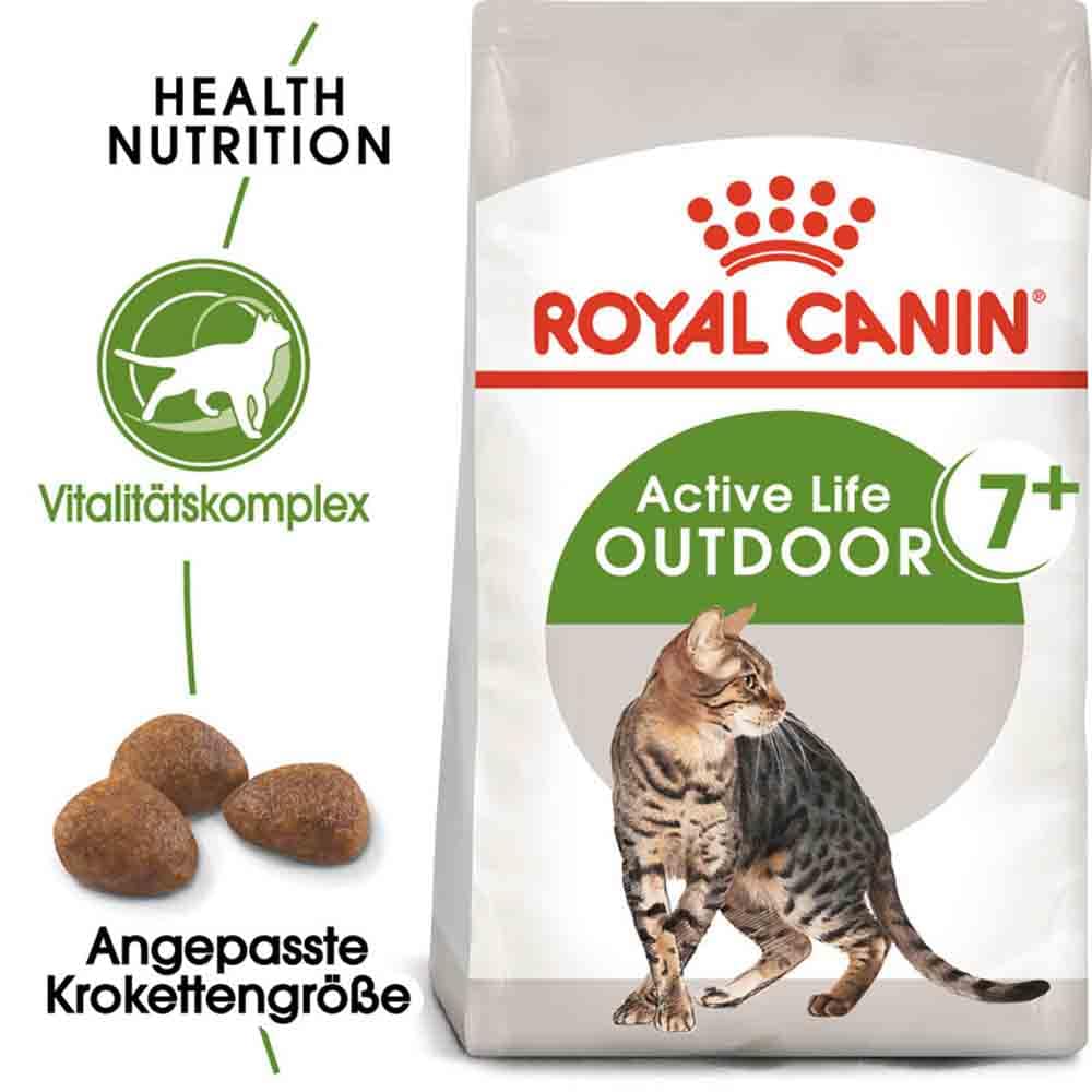 - Warum ein besonderes Futter für aktive Freigänger ab 7 Jahren?Wenn Ihre aktive, erwachsene Katze viel Zeit im Freien verbringt, ist es wichtig, sie mit einem Futter zu versorgen, das die notwendigen Nährstoffe zur Aufrechterhaltung einer optimalen Gesundheit enthält.ROYAL CANIN Outdoor 7+ ist für aktive Katzen, die vorwiegend draußen leben, ab dem 7. Lebensjahr geeignet und enthält einen exklusiven Vitalitätskomplex, der Ihre Katze bei den ersten Anzeichen des Alterungsprozesses unterstützt.Dieses Futter ist mit speziellen Nährstoffen angereichert, wie zum Beispiel Polyphenolen aus Grünem Tee, Vitamin C, EPA und DHA. Omega-3-Fettsäuren wie EPA und DHA unterstützen die Knochen- und Gelenkfunktion.Für eine erwachsene Katze, die vorwiegend draußen lebt, steht ausgiebige körperliche Bewegung wie Laufen, Springen und Klettern auf der Tagesordnung - ROYAL CANIN Outdoor 7+ hilft dabei, die Gesundheit der Gelenke Ihrer Katze zu erhalten.Sowohl in städtischen als auch in ländlichen Gebieten zeigen sich Katzen, die vorwiegend draußen leben, von Natur aus neugierig und erkunden gern. ROYAL CANIN Outdoor 7+ enthält einen hohen Kaloriengehalt, um den hohen Energiebedarf von aktiven Katzen, die viel Zeit im Freien verbringen, abzudecken.ROYAL CANIN Outdoor 7+ unterstützt außerdem die Nierenfunktion Ihrer Katze durch einen speziell angepassten Phosphorgehalt.Des Weiteren trägt ROYAL CANIN Outdoor 7+ mit speziell ausgewählten Nährstoffen zur Erhaltung der Harnwegsfunktion Ihrer erwachsenen Katze bei.ROYAL CANIN QualitätsversprechenAlle ROYAL CANIN Produkte durchlaufen eine umfassende Qualitätskontrolle, um eine optimale Futterqualität zu gewährleisten und den individuellen Ernährungsbedürfnissen sowie dem Lebensstil Ihrer Katze gerecht zu werden. Das bedeutet, mit ROYAL CANIN Outdoor 7+ bieten Sie Ihrer Katze eine hochwertige und ausgewogene Ernährung.