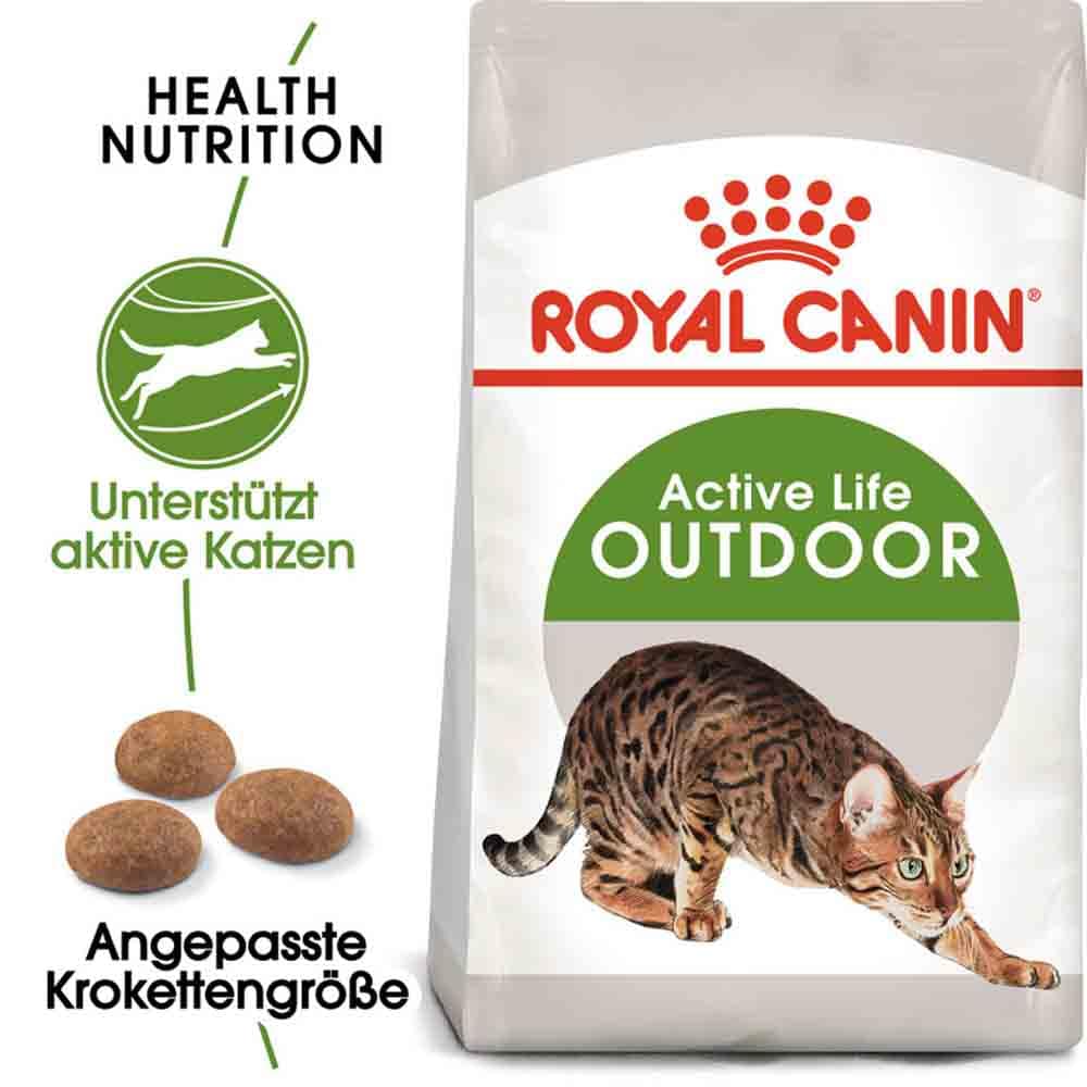 - Warum ein besonderes Futter für aktive Katzen?Katzen, die gerne draußen sind und einen aktiven Lebensstil führen, stellen besondere Bedürfnisse an ihre Ernährung. Darüber hinaus werden ihre Abwehrkräfte stetig gefordert. ROYAL CANIN Outdoor Katzenfutter hat einen hohen Energie- und Kaloriengehalt, um den Ernährungsbedürfnissen von Katzen mit einem aktiven Lebensstil und regelmäßigem Auslauf im Freien gerecht zu werden.ROYAL CANIN Outdoor Futter ist speziell auf die Bedürfnisse von Katzen mit regelmäßigem Auslauf und Bewegung abgestimmt und enthält alle notwendigen Nährstoffe für die aktive Katze.ROYAL CANIN Outdoor Katzenfutter hat einen hohen Kaloriengehalt, um den Ernährungsbedürfnissen von Katzen mit einem aktiven Lebensstil und regelmäßigem Auslauf im Freien gerecht zu werden.ROYAL CANIN Outdoor Futter enthält eine spezielle Antioxidanzienformel, die das Immunsystem von Freigänger-Katzen unterstützt, während die enthaltenen Präbiotika sich positiv auf die Darmflora auswirken und so für eine optimale Darmgesundheit sorgen können. Die Kombination aus ausgewählten Nährstoffen unterstützt die Barrierefunktion der Haut sowie den allgemeinen Gesundheitszustand von Haut und Fell.Katzen mit Auslauf entdecken gerne ihre Umgebung. Zur Unterstützung von körperlich fordernden Bewegungen, wie Laufen, Springen und Klettern, enthält ROYAL CANIN Outdoor Futter eine Kombination aus Omega-3-Fettsäuren (EPA und DHA), welche die Gelenke schützen können.ROYAL CANIN QualitätsversprechenAlle ROYAL CANIN Produkte durchlaufen eine umfassende Qualitätskontrolle, um eine optimale Futterqualität zu gewährleisten und den individuellen Ernährungsbedürfnissen sowie dem Lebensstil Ihrer Katze gerecht zu werden. Das bedeutet, mit ROYAL CANIN Outdoor bieten Sie Ihrer Katze eine hochwertige und ausgewogene Ernährung.
