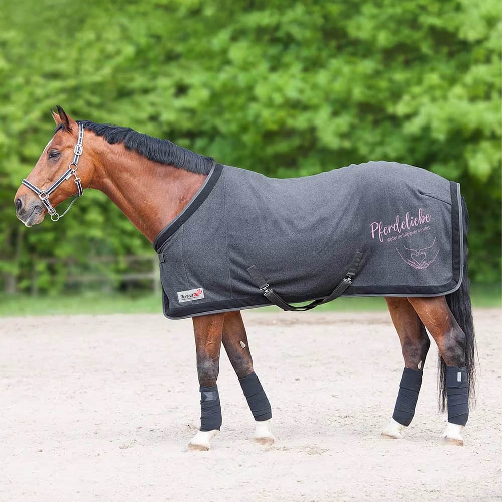 Egal, ob beim Training daheim, im Gelände oder auf dem Turnierplatz: Die Tierarzt24 Abschwitzdecke "Pferdeliebe" ist überall ein echter Hingucker! Das Material dieser hochwertigen Fleecedecke ist extra weich und bietet die perfekte Abschwitzfunktion. Der Frontverschluss wird durch eine zusätzliche Klettabdeckung geschützt, die Schweifkordel und die abnehmbaren Kreuzgurte (ebenfalls Klettverschlüsse) sorgen für den perfekten Halt.
